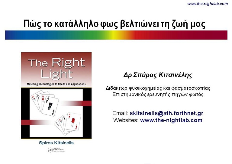 Με αφορμή το τελευταίο βιβλίο από τον οίκο Taylor and Francis που αφορά θέματα ποιότητας φωτός και επιλογής τεχνολογιών για κάθε εφαρμογή (εσωτερικός φωτισμός, εξωτερικός, ειδικές εφαρμογές, υγεία κτλ. , ο συγγραφέας Δρ Σπύρος Κιτσινέλης προσφέρει σε συναδέλφους που έχουν προμηθευτεί αντίτυπα, δωρεάν παρουσιάσεις των θεμάτων στο χώρο τους.